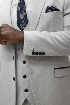 Marc Darcy Bromley stone suit jacket. The blazer features a two button fastening to the front and double vent to the reverse, along with contrast navy buttons and buttonhole stitching. Luxurious paisley lining and prestigious Marc Darcy lapel pin badge complete the look.