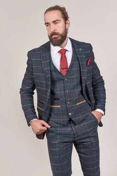 The epitome of a true gentleman. The Eton suit displays a red and gold detailed check, exuding timeless luxury. Feel effortlessly stylish in this exceptional quality suit from Marc Darcy at Master Debonair.