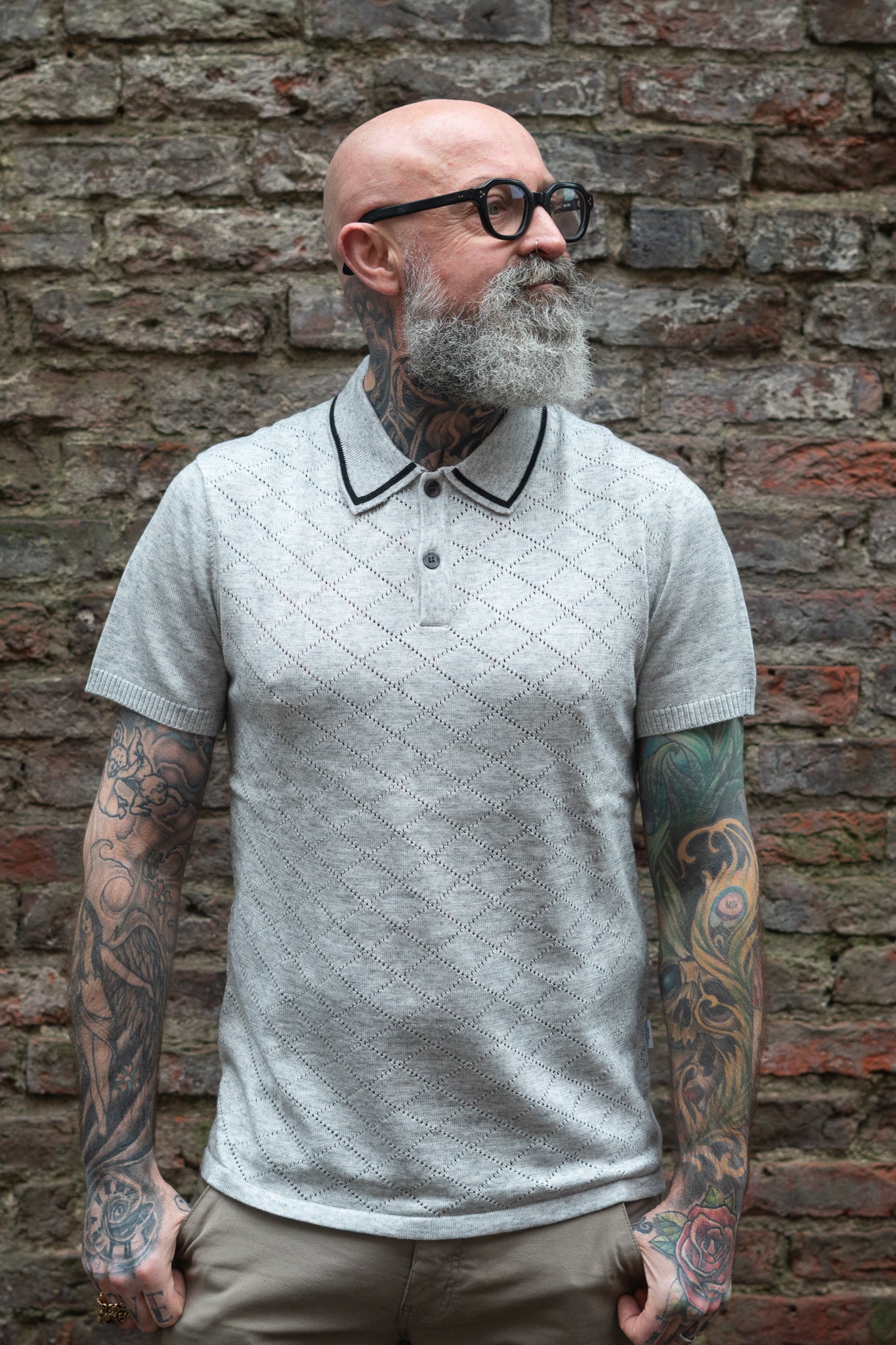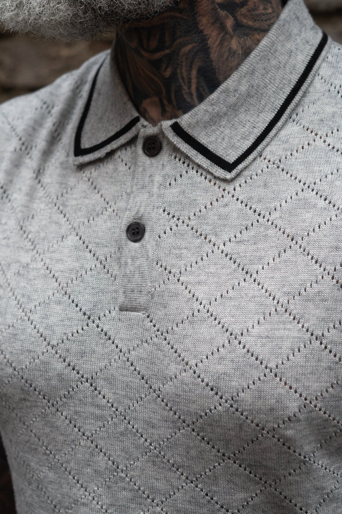 A classic polo fit in a fine knit material, perfect for layered looks this season. Its neutral tones and jacquard knit style make it extremely easy to style and comfortable to wear, we recommend styling it with a pair of beige chinos and brown oxford shoes for a tonal look that will take you from day to night seamlessly.